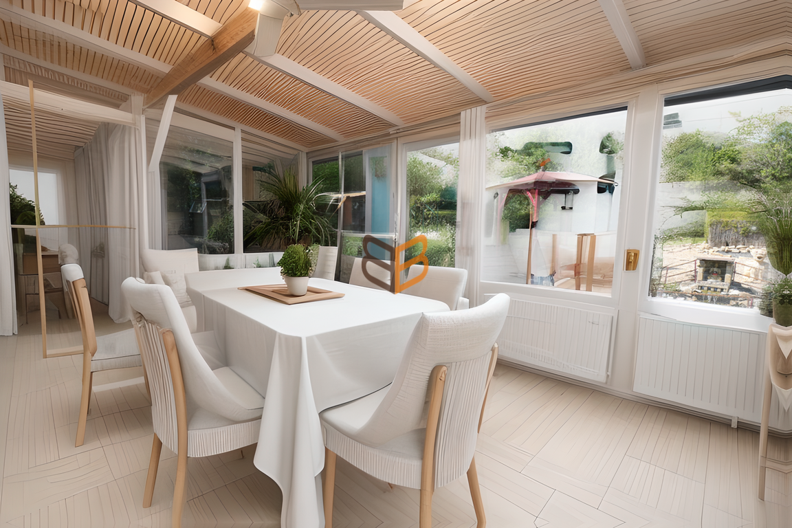 À l’extérieur, vous profiterez d’une belle véranda donnant sur une terrasse agréable, prolongée par un jardin d’agrément joliment aménagé (bassin à poissons, pelouse, abri de jardin, coin jardinage et barbecue).